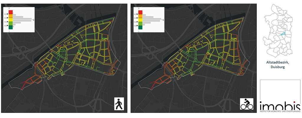Obwohl die gesundheitlichen und ökologischen Vorteile aktiver Mobilität gut belegt sind, gibt es bislang nur wenige Untersuchungen zu ihrer Resilienz während Hitzewellen. Diese Studie schließt diese Forschungslücke, indem sie stadtbezogene Walkability- und Bikeability-Indizes anhand eines multikriteriellen, georäumlichen Ansatzes am Beispiel der Stadt Duisburg entwickelt. Zentrale Umwelt- und Infrastrukturfaktoren wie städtisches Grün, Verschattung durch Gebäude und Bäume, Verkehrsdichte, Streckenqualität, Sicherheit und Zugang zu Versorgungseinrichtungen wurden räumlich analysiert und in ein GIS-basiertes Modell integriert. Ein besonderer Schwerpunkt lag auf der Wechselwirkung dieser Faktoren bei hohen Temperaturen. Ziel war es, zu ermitteln, ob diese Interaktionen aktive Mobilität begünstigen oder behindern. Die daraus resultierenden Indizes wurden in thematischen Karten visualisiert, um Zonen unterschiedlicher Resilienz zu identifizieren und um qualitative sowie quantitative Einblicke in die Fähigkeit der gebauten Umwelt zu ermöglichen, aktive Mobilität während Hitzewellen aufrechtzuerhalten.